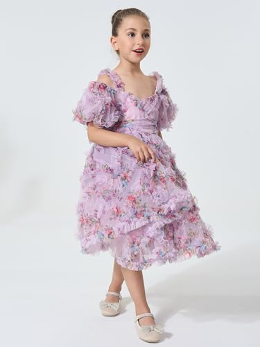 2Bunnies Girls' Tiered 3D Floral Ruffled Tulle Off Shoulder Puff Sleeve Sweetheart Neckline Dress 6