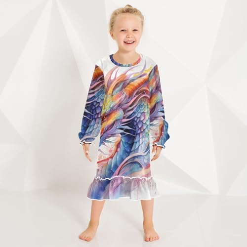 Watercolor Fire Rainbow Dragon Girls Long Sleeves Dress, Winter Dresses Nightgowns Casual Swing Dress 6