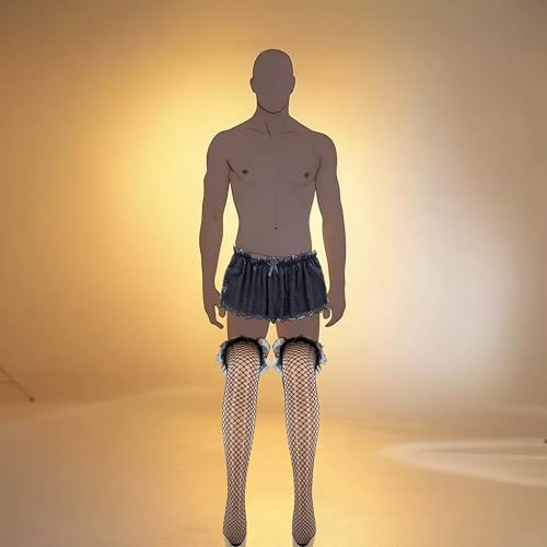 • men's sissy Mini Skirt Panties Set, Low Ruffled Lace Mini Skirt with Bow Embellishment and Breathable Panty Liner, Lace Embellished Thigh Fishnet Stockings Sweet and flirty design style, this sissy lingerie is perfect for Crossdressing.