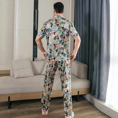 Men's Satin Pajama Set Short Sleeve Silky Pajamas Pants 3PCS Button Down Sleepwear Multicolor Silky Men's Pajama Set 6