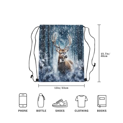 Erosebridal 3D Deer Drawstring Backpack 13x15.7, Safari Wild Animal Drawstring Bags, Elk Snowflakes Hunting Reversible Draw String Back Bag For Swim Yoga, Woodland Wildlife String Backpack 1