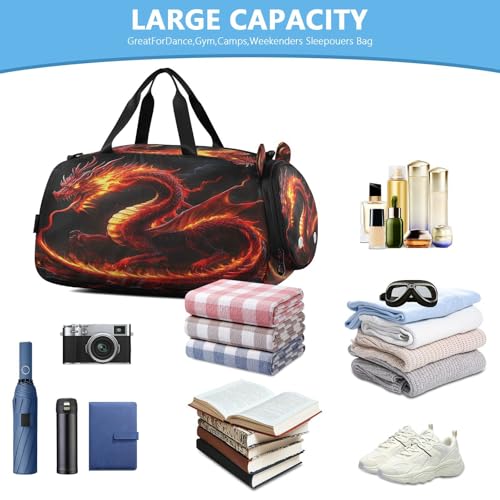 HOT ! Gym Travel Duffle Bag for Boys Girls Fire Dragon Sports Dance Bag with Shoe Compartment & Wet Pocket Football Kids Travel Bag Teens Sleepover Carry