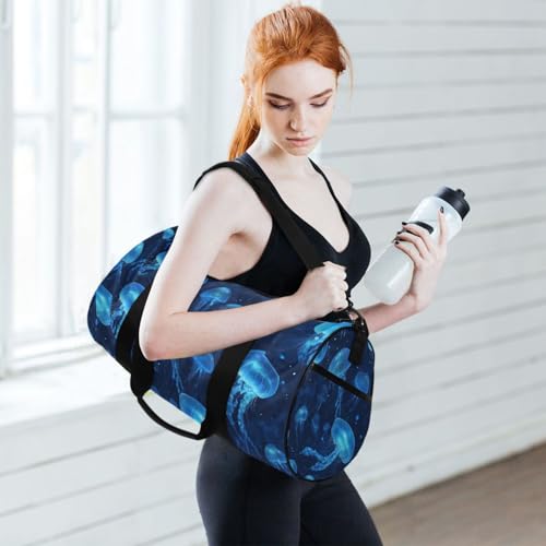 HOT ! Blue Jellyfish Sports Duffel Bag Full Print Barrel Gym Bag with Side Zipper Pocket and Inner Compartment, Durable Lightweight Fabric for Sports, Training, Travel and Outdoor Use