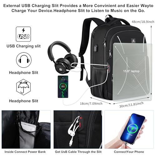 • USB Charging Port and Luggage Sleeve: 17 inch sturdy computer backpack for men with external USB charger port and built in charging cable can conveniently charge your cell phone, tablet and other electronic devices while walking. Featuring the trolley belt on its breathable back, business traveler could fit large backpack right on the luggage suitcase, which free your hands