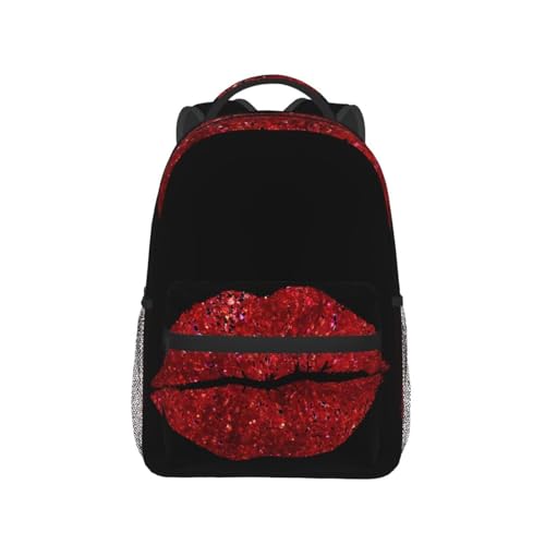 HOT ! Red Glitter Lips Casual Backpack Travel Pack Bag Laptop Backpacks With Side Pockets Front Zipper Pockets Bookpack Daypack Picnic Rucksack Computer Bag
