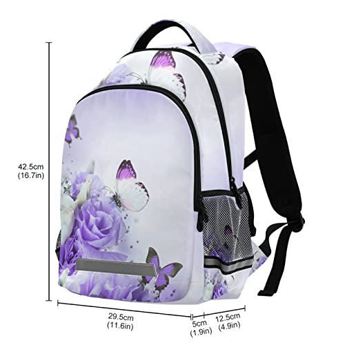 ALAZA Purple Rose Flower Butterfly Backpacks for Girls Boys Kids School Book Bags 3rd 4th 5th Grade Laptop Casual Daypack Travel Shoulder Bag with Chest Strap 3