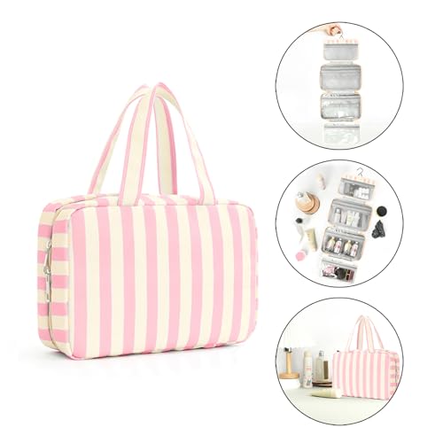 HOT ! Toiletry Bag for Women Travel Water-resistant Cosmetic Bag Fashion Stripes Makeup Bag with Hanging Hook Preppy for Store Toiletries Cosmetic Accessories Large Capacity Pink