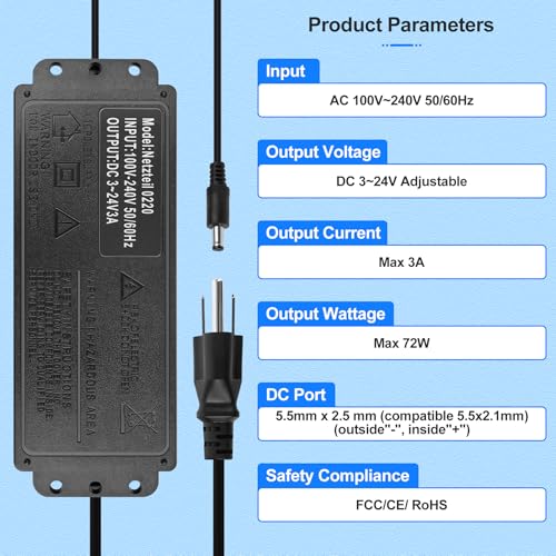 • Parameters: Input: AC 100- 240V, 50/60Hz; Output: DC 3~24V adjustable, maximum 3A 72W; It is suitable for most appliances with an input voltage between 3V and 24V and a rated power of 72 watts or less