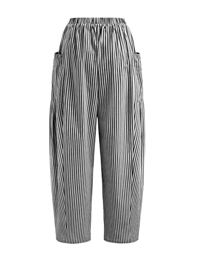 HOT ! Yeokou Women Wide Leg Pants Casual Striped Cotton Mid Rise Drawstring Palazzo Trousers with Pockets