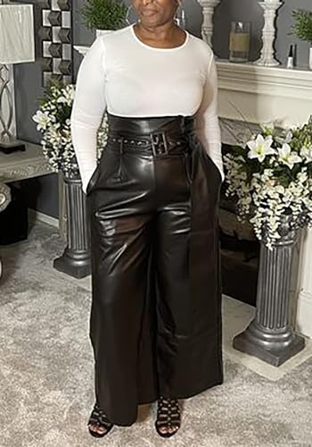 Tcremisa Leather Pants for Women High Waisted Faux Leather Straight Wide Leg Pant PU Trousers with Belt 5