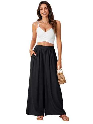 HOT ! Rooscier Women's Wide Leg Elastic High Waist Flowy Lounge Trousers Maxi Pants with Pockets