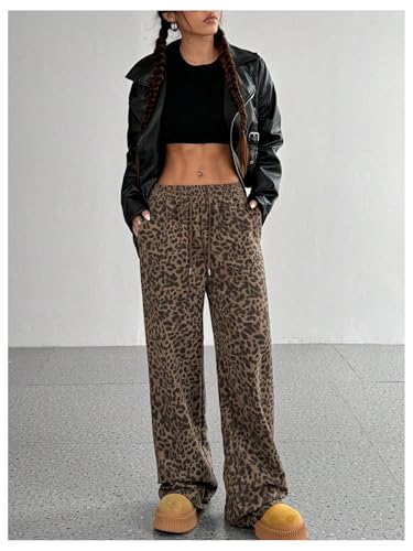 HOT ! COZYEASE Women's Leopard Wide Leg Baggy Pants Drawstring Waist Y2K Trousers with Pocket