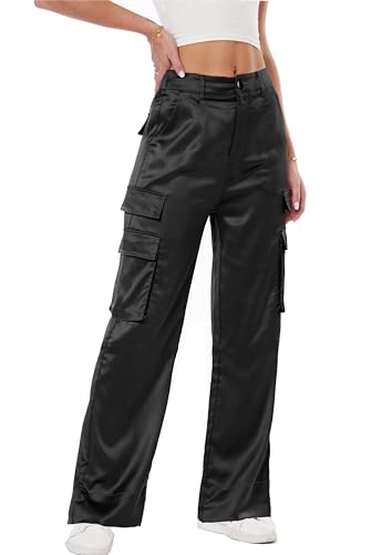 HOT ! Women's Wide Leg Cargo Pants Satin Silky Casual High Waist Y2K Baggy Cargo Pants Combat Military Trouser