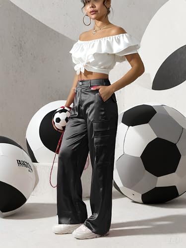More information about Women's Wide Leg Cargo Pants Satin Silky Casual High Waist Y2K Baggy Cargo Pants Combat Military Trouser