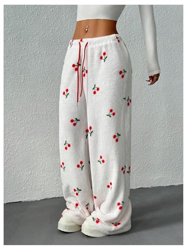 HOT ! Women's Cherry Graphic Lounge Pants Y2k Fuzzy Drawstring Waist Straight Leg Casual Trousers