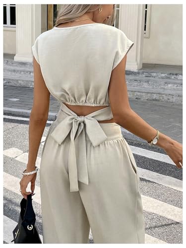 HOT ! Verdusa Women's 2 Piece Business Casual Outfits Tie Back Summer Tops and Wide Leg Pants with Pockets
