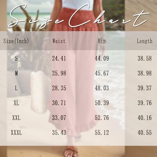 • Fabric type: Material: The beach pants for women are made of Cotton & Linen. Beach Pants for Women offer a loose and airy fit, lightweight and comfy fabric make this high waisted ruffled pants more comfy and stylish on casual or work. Wide leg coverups are soft and comfortable for beach, daily life, coffee shop, vacation, honeymoon, work, back to school and out going