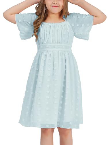 EXLURA Girls 2025 Summer Dresses Short Sleeve Swiss Dot Square Neck Flowy A Line Kids Dress Casual Party Midi Dress 6-15Y 6