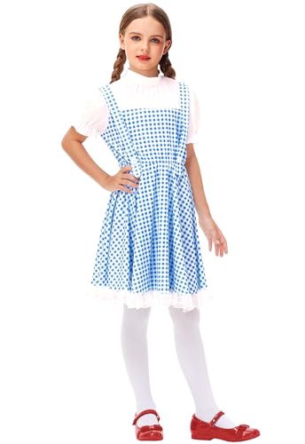 • Wizard Costume: Blue and White Gingham Graphic, Short Puff Sleeve, White Lace Flare Hem, A Vivid and Fun Character Cosplay Outfits for you in this Halloween Holiday