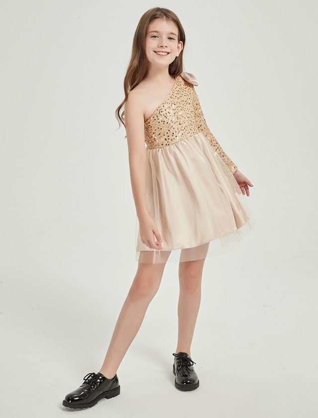 EXARUS Girls Sequin Sparkle Party Tulle Tutu Dress One Shoulder Fancy Long Sleeve Special Occasion Short Dress 4
