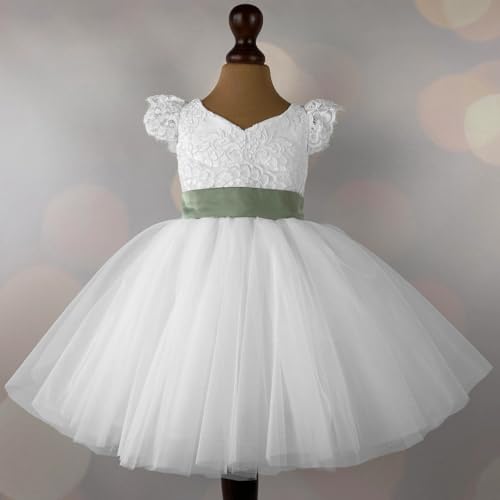 More information about Custom Flower Girl Dress Tulle Floral Pattern Appliques Top with Green Bow Belt Cap Sleeve for Wedding Party Birthday Banquet Holy Communion Gowns