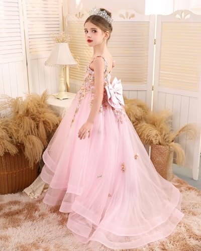 Tulle Flower Girl Dress with Bow Floral Appliques Pageant Dresses for Girls Spaghetti Straps Ball Gown Communion Dress 6