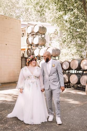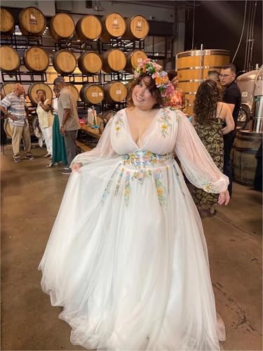More information about Tulle Puffy Sleeve Prom Dresses Flower Embroidery Formal Gowns Long Sleeves V Neck Evening Party Gown with Slit