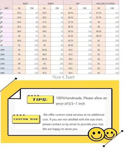 • ♥SIZE DETAILS:Please refer to our size chart in the product image section on the left. PLEASE NOT AMAZON SIZE CHART. We accept free customization service, if you want to customize the dress, Please provide us your measurements of the Bust, Waist, Hips and Hollow to Floor when you place the order. The dress will be made fit you perfect, please contact with us by email within 12 hours after you place order.