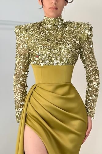 More information about Sequin Sparkly Mermaid Prom Dresses Long Sleeve Satin High Neck Halter Evening Formal Party Gown with Slit 2024