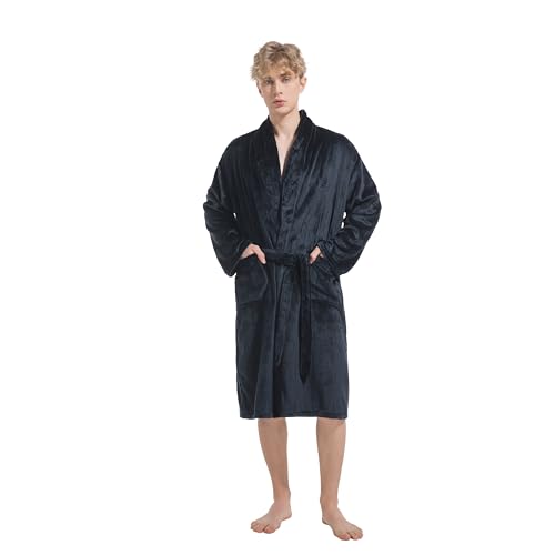 HOT ! Plush Velvet Bathrobe for Men, Long Length Soft Spa Robe with Shawl Collar & Belt, Thick Absorbent Hotel Style Lightweight Fabric, Gift for Him (Navy Blue)