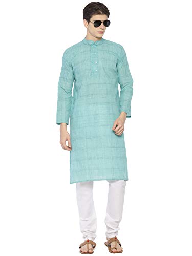 HOT ! PAROKSH Men's Teal Solid Handloom Cotton Dual Button Straight Khadi Kurta Large