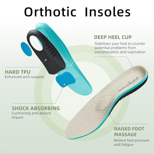 • REMOVABLE INSOLE: The orthotic inserts offers a level of high arch supports. Deep heel cup can reduce the overstretch of plantar fasciitis, relief pain from heel pain & heel spurs. Increase the stressed area to balance the pressure on front and back heel. GEL material is excellent for shock absorption and pain relief. The black hard TPU material on the back of the insole supports the arch of your foot and wraps your heel when you walking