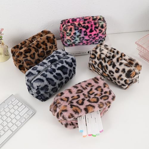 HOT ! Checkered Makeup Bag Plush Cosmetic Bag Asthetic Plaid Handbags Cute Zipper Travel Toiletry Bag Soft Storage Pouch Pencil Case Bag for Women Girls (Leopard print-E)