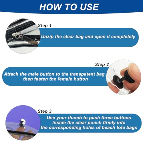• High Quality Material: The clear travel bag made of 0.6mm thick transparent PVC material; Perfectly keep things dry and clean; The crystal clear inner pouches have well-constructed sturdy zippers; work smoothly and can be closed firmly; Compatible with 19 x 15 x 9.5 and 15 x 13 x 5.25 Beach Tote Bag