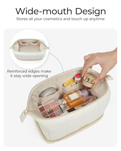 • 【Convenient Wide Opening】This travel makeup bag boasts a wide opening for easy access to your cosmetics. The built-in iron bar provides structural support, ensuring the opening stays spacious, allowing you to quickly locate your essentials while applying makeup without any interruptions