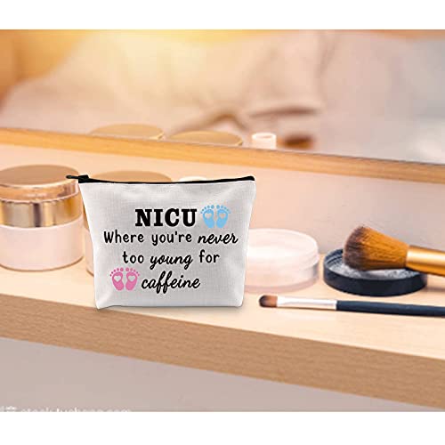 JXGZSO Nurse Midwife Gift NICU Nurse Makeup Bag NICU Where You’re Never Too Young For Caffeine Cosmetic Bag Preemie Nurse Gift (Too Young For B) 1