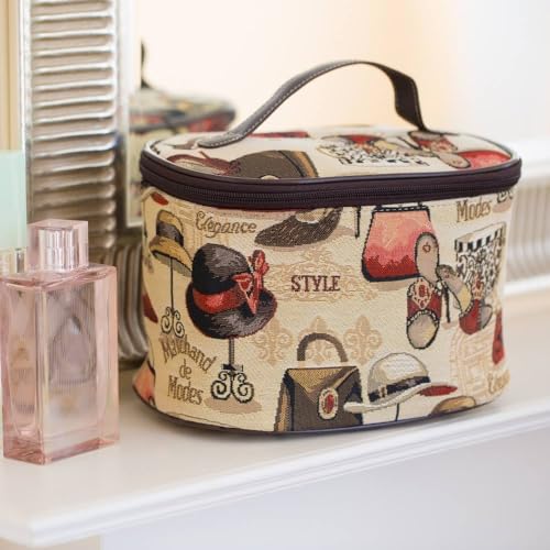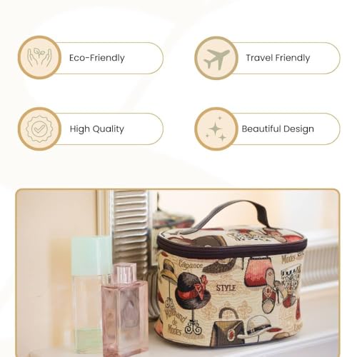 • The main material for this makeup bag is made from a high-quality woven tapestry, which gives it a carpet bag effect. The uniqueness of a SIGNARE TAPESTRY bag is the design artwork. Every Signare product has its personality and story to tell. This is fashion boutique pattern for women brings a chic touch in your style. With motifs of shoes, hats and makeup.