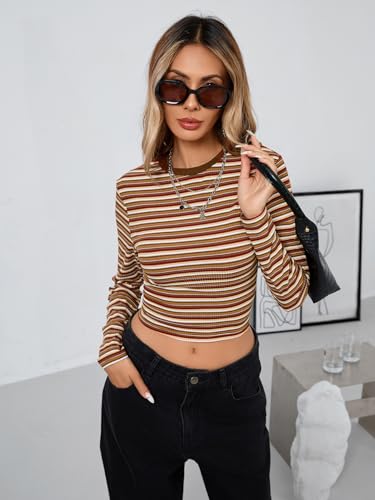 Milumia Women's Retro Fitted Long Sleeve Striped T Shirt Colorful Ribbed Crew Neck Fall Crop Top 6