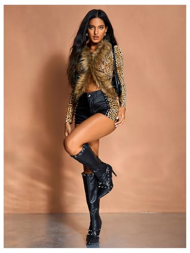 • Features: Animal print, faux fur trim, long sleeve, V neck, crop, slim fit tee shirt for women