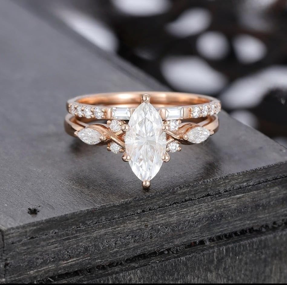 HOT ! Generic Marquise cut Moissanite engagement ring set Unique Rose gold Baguette cut gemstone wedding band Bridal ring set Anniversary ring for her, Colourless
