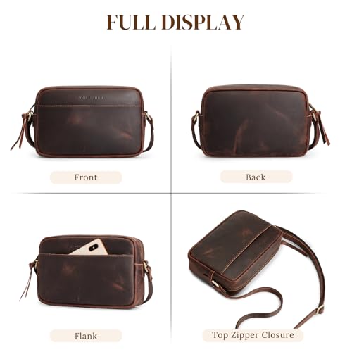 • Top-grain Leather: This crossbody bag for women is made of Top Grain Crazy Horse Leather providing you with the strongest and most durable leather purse. Brass-tone rustproof heavy-duty metals are a great match. Reinforced and neat stitching is the icing on the cake