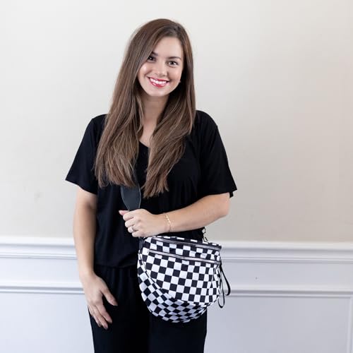 • Checker Print Chic, Day-to-Night Flex: Pair this black-and-white crossbody with leggings for brunch or a sequin top for night outs – nylon resists wrinkles while vegan leather trim elevates it beyond basic fanny packs.