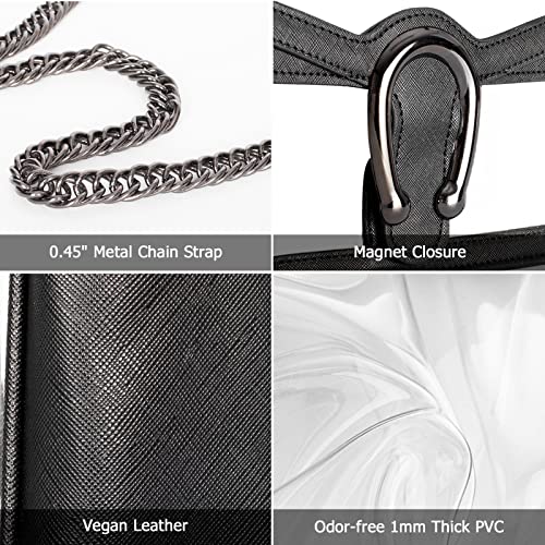 • Elegant, Luxury and Durable: We made this clear handbag shoulder bag with high fashion quality standards to keep you elegant in any event. Crafted from heavy-duty 1 mm thick PVC and vegan leather trim, nickel-tone hardware, chic grommets details, and front flat magnetic closure. This durable and luxurious bag is odor-free and not easy to get defects such as cracks, punctures, melt, or disintegrate.