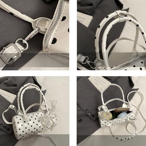 Polka Dot Purse Retro Crossbody Barrel Bag with Pearl Bow Mini PU Leather Top Handle Shoulder Handbag for Women 6