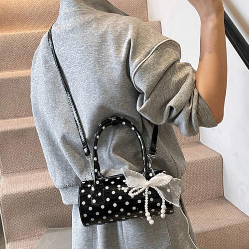 HOT ! Polka Dot Purse Retro Crossbody Barrel Bag with Pearl Bow Mini PU Leather Top Handle Shoulder Handbag for Women