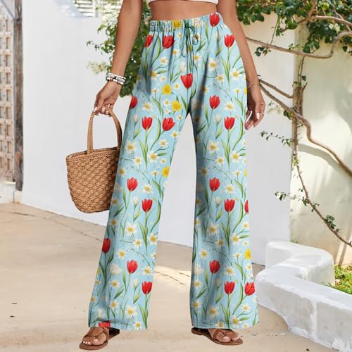 Womens Tulip Print Pants Summer Boho Floral Graphic Casual Trousers Elastic Drawstring High Waist Pant Lightweight 1