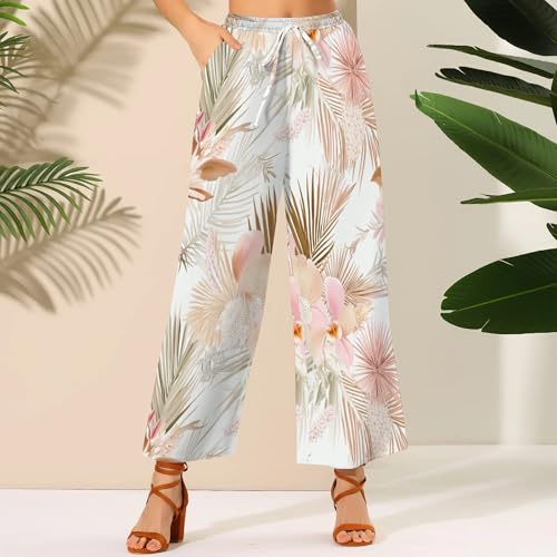 Womens Floral Print Casual Wide Leg Pants High Waisted Drawstring Beach Trousers with Pocket 1