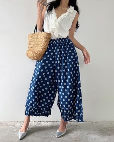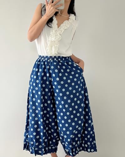 • Summer crop pants featuring vintage polka dot patterned, pull on closure, elastic high waist, wide leg pleated bottom, 2 side entry pockets. Suitable for summer, spring and fall.