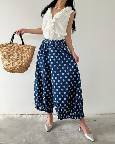 chouyatou Women Polka Dot Printed Wide Leg Cotton Pants Loose Elastic Waist Palazzo Trousers with Pockets 1