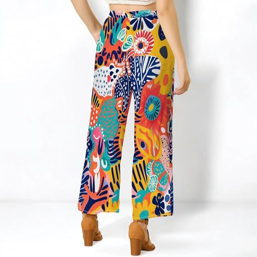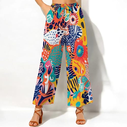 HOT ! Womens Cartoon Graffiti Pants Stretch Waist Wide Leg Tropical Loose Straight Beach Flowy Trousers with Pockets